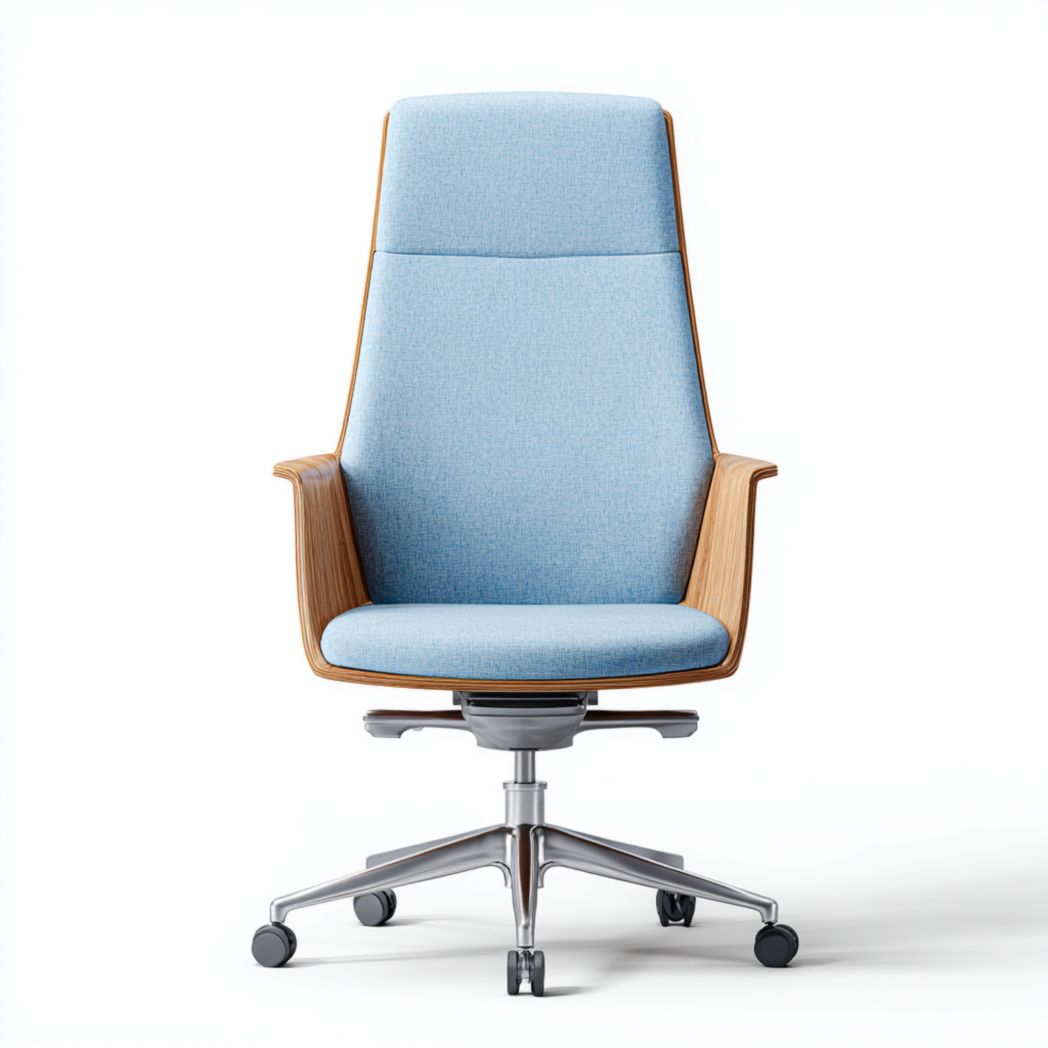 Matériau : Assise et dossier en tissu polyester, accoudoirs et coque en bois plaqué, base en acier chromé avec roulettes